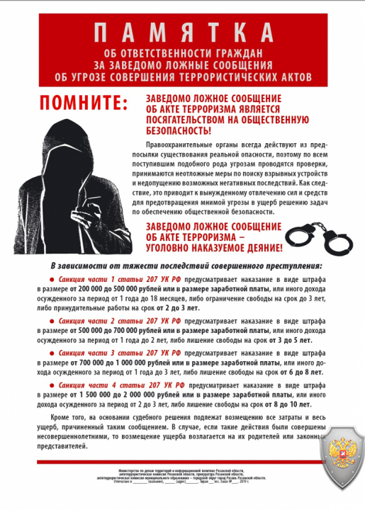 Памятка. Заведомо ложное сообщение об акте терроризма - уголовно наказуемое деяние.